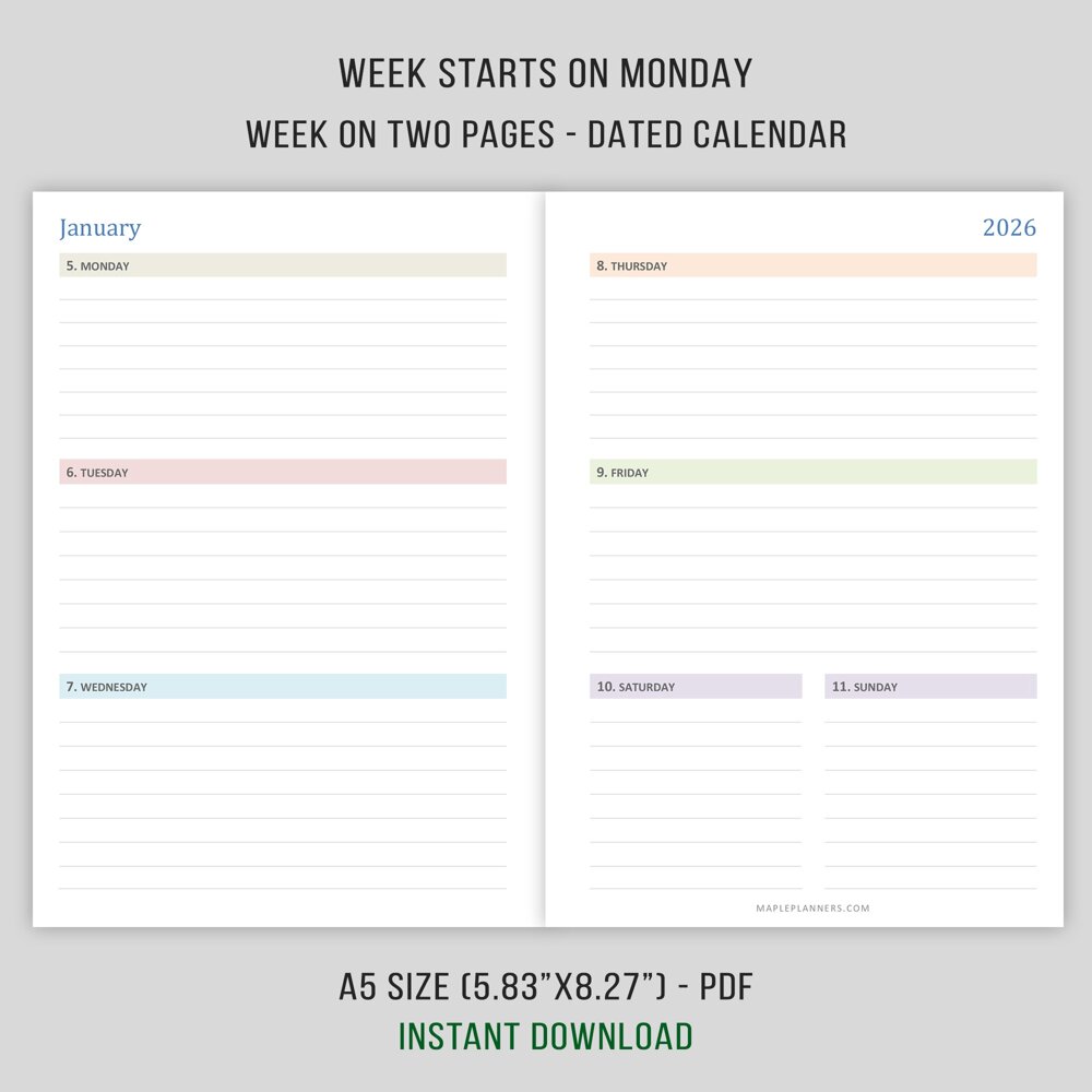 Stay organized with our 2026 A5 Weekly Planner Printable. It features a horizontal layout and a Monday start. This printable planner includes ample space for daily notes, appointments, and to-do lists while keeping your schedule simple and functional.